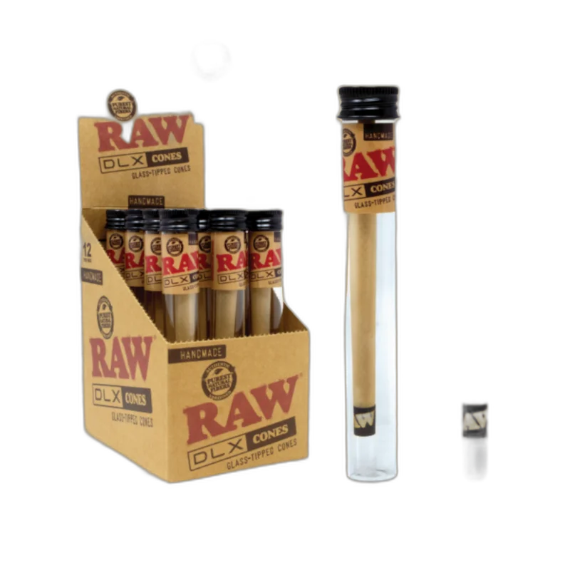 The RAW GLASS TIPPED DLX CONES DISPLAY OF 12 (RAW-150) delivers a quality smoking experience backed by RAW's reputation. This cone features glass construction for smooth airflow and even burning. A staple product for any well-stocked smoke shop. Wholesale quantities at Port City Wholesale.
