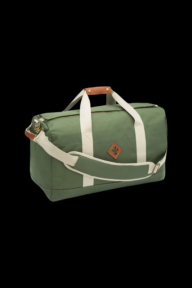 The Weekender by Revelry Supply is the ideal intermediate-sized, smell-proof duffle bag e for those spontaneous weekend getaways. This bag is not just about functionality; it's a style statement that enhances your travel experience. Designed with a keen eye for aesthetics, The Weekender is available in a wide range of colors and boasts genuine leather accents, ensuring you travel in style. Compact and easy to handle at 24” x 14” x 13” , it's the perfect companion for your short escapes. Carry it your way with the removable shoulder strap and end handles, adding a touch of personal comfort to your journey. Security is a priority with this lockable duffle, featuring a carbon filter system with activated charcoal to keep your adventures discreet . Concerned about odor? Tuck your cannabis in the inner stash pocket , and let the carbon filter system do its magic. The rubber-backed exterior ensures durability, and the waterproof zipper with the hook and loop zipper covering prepares you for any weather. Revel in the freedom of spontaneous travel with this exceptional duffle by Revelry Supply!