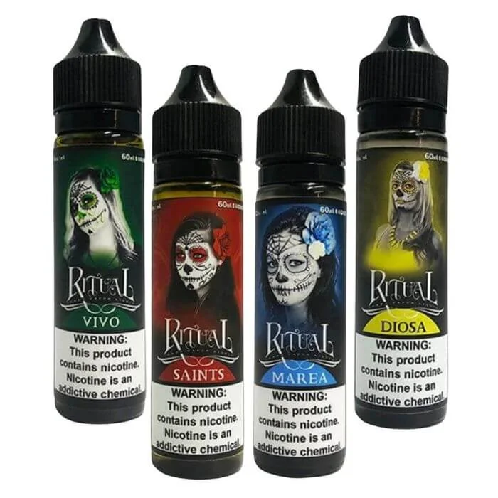 Introducing the new Ritual Craft Vapor E-Liquids, available in 60ml and 120ml bottles with nicotine options of 0mg, 1.5mg, 3mg, 6mg, and 12mg. These premium e-liquids are crafted for vape enthusiasts seeking rich, complex flavors and a smooth vaping experience. Perfect for all-day vaping, Ritual Craft Vapor blends unique flavor profiles that cater to a variety of tastes. Flavors: Catrina: A rainbow sherbet ice cream flavor with fresh fruit inhales and cool creamy undertones. Catrina is an all day vape that never gets old and changes with every vape. Diosa: A lemon candy flavor with a sour outer shell and a savory sweet center. Think of her as a goddess for your tastebuds. Marea: This amazing concoction perfectly mixes blueberries and raspberries together, then blends them into a perfect snowy treat. Ritual: A complex candy flavor with sour and creamy undertones. This one will keep your mind guessing, and your taste buds asking for more. Saints: A sweet and vivid strawberry licorice flavor. A great deal of time has been spent in researching this mix. Vivo: Vivo Vape Juice is an excellent blend of limes and strawberries that excite and tantalizes the senses. Elevate your vaping ritual with Ritual Craft Vapor E-Liquids, where premium craftsmanship meets extraordinary flavor.