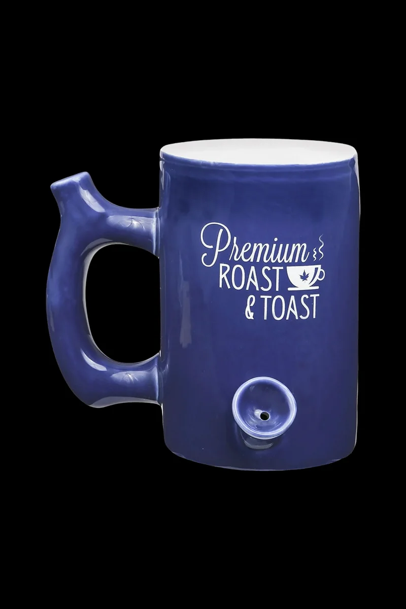 Make your wake and bake morning routine even more enjoyable with the Premium Roast & Toast Mug Pipe . This is a hybrid coffee cup/smoking pipe with a bowl on the front for packing your herbs and mouthpiece built right into the handle for taking your puffs. Fill the mug with coffee or tea, then pack the bowl and light it up. Then it's just sip sip puff, sip, puff, sip sip all you want. Use the built-in carb hole to control the size and intensity of your rips. Made of ceramic, this mug pipe is available in several colors. Pick your favorite and order one today.