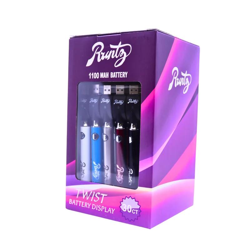 The Runtz 1100mAh Twist Batteries provide a versatile and powerful vaping solution. Featuring adjustable voltage settings via a simple twist mechanism, these batteries are compatible with a wide range of 510-thread cartridges. With a sleek design and robust build, they offer both style and durability. This display pack includes 30 batteries, making it ideal for retail outlets or bulk buyers. Key Features: Adjustable Voltage: Twist mechanism for easy customization of voltage settings to suit diff
