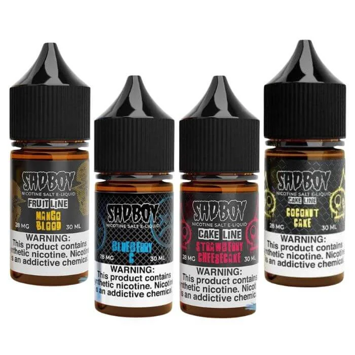 Introducing the new SadBoy Nicotine Salts, available in 30ml bottles with 28mg and 48mg nicotine. This premium collection delivers a satisfying vaping experience with a range of delicious, dessert-inspired flavors that are perfect for any sweet tooth. Crafted for MTL (mouth-to-lung) vaping, these nicotine salts provide smooth throat hits and rich flavor profiles, making them ideal for vape enthusiasts looking for quality and variety. Flavor Descriptions: Blueberry Cookie: A delightful blend of warm cookies and ripe blueberries. Blueberry Jam Cookie: Sweet blueberry jam spread over a freshly baked cookie. Butter Cookie: Rich, buttery cookies with a golden-brown finish. Coconut Cake: A soft, moist cake infused with creamy coconut. Custard Cookie: A perfect combination of smooth custard and crisp cookies. Key Lime Cookie: Tangy key lime flavor wrapped in a sweet cookie base. Lemon Jam Cookie: Zesty lemon jam layered on a buttery cookie. Mango Blood: Juicy, ripe mangoes with a touch of sweetness. Pumpkin Cookie: Spiced pumpkin cookies baked to perfection. Punch Berry Blood: A mixed berry punch with a hint of tartness. Punch Berry Iced: A frosty twist on the original Punch Berry. Rainbow: A colorful burst of fruity flavors. Rainbow Iced: The classic Rainbow with a refreshing menthol finish. Shamrock Cookie: A minty cookie treat with a creamy texture. Strawberry Blood Ice: Sweet strawberries with a cool, icy exhale. Strawberry Cheesecake: Creamy cheesecake topped with fresh strawberries. Strawberry Jam Cookie: Strawberry jam spread on a buttery cookie. Unicorn: A magical blend of fruity and sweet flavors. Funnel Cake: Every puff is like having a warm, freshly fried funnel cake, dusted with powdered sugar for a sweet treat. Elevate your vaping experience with SadBoy Nicotine Salts, where dessert-inspired flavors meet smooth, satisfying nicotine.