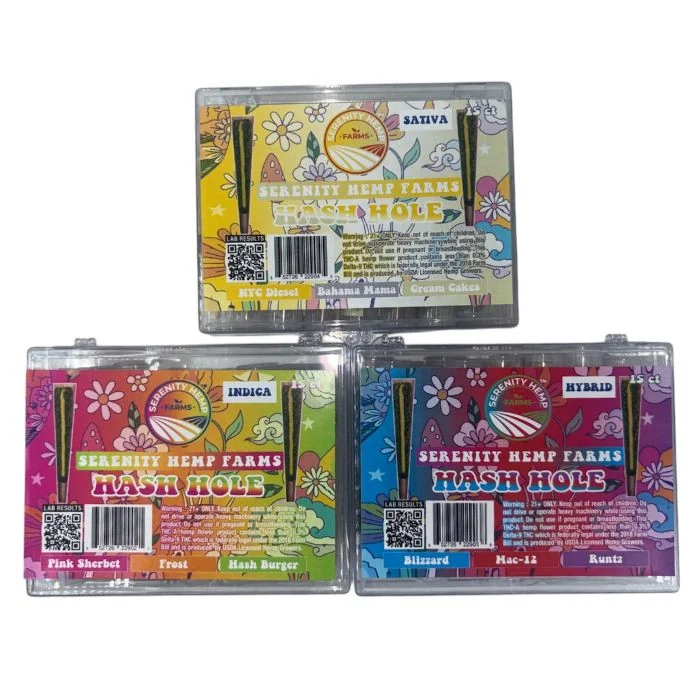 Serenity Hemp THC-A Hash Hole Pre-Rolls – 15ct Variety Pack Crafted for premium potency and flavor, Serenity Hemp THC-A Hash Hole Pre-Rolls combine top-shelf THC-A flower with solventless rosin for a smooth, powerful, and flavorful smoke. These slow-burning pre-rolls are ideal for vape shops, dispensaries, and wholesale buyers looking for high-end cannabis products that deliver results. What’s Inside:Each variety pack includes 15 pre-rolls total — 5 Sativa, 5 Indica, and 5 Hybrid. Each strain category features 3 distinct flavors, offering a diverse, well-rounded smoking experience. Sativa: Bahama Mama – Tropical and fruity with a mood-lifting kick. Cream Cakes – Sweet, creamy, and energizing. NYC Diesel – Zesty citrus and diesel with a cerebral boost. Indica Strains: Frost – Cool, crisp, and deeply relaxing. Hash Burger – Earthy, savory, and great for winding down. Pink Sherbet – Floral sweetness with a calming body high. Hybrid Strains: Blizzard – Smooth and refreshing with balanced effects. Mac 12 – Herbal and creamy with a euphoric uplift. Runtz – Candy-sweet and mellow for anytime enjoyment. This curated pack delivers a flavorful and potent variety for any occasion.