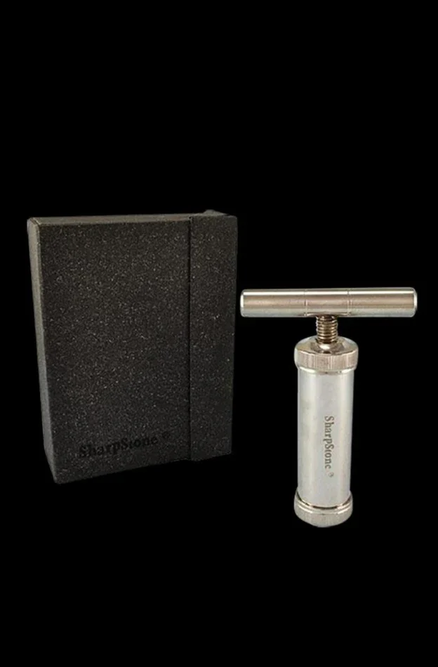 Conserve your finest herbal material with the Sharpstone T-Style Press. This press is designed to transform your precious pollen particles into easy to use and store discs. The material will fit in the tube chamber, and you only need to twist the handle to quickly get a tight press. The T-style Press comes in a convenient case, becoming a great gift idea for a fellow herb enthusiast. The press is built with indestructible aircraft grade billet aluminum. Available in small (3.5 inches), medium (5.3 inches) and large (6.2 inches) sizes.