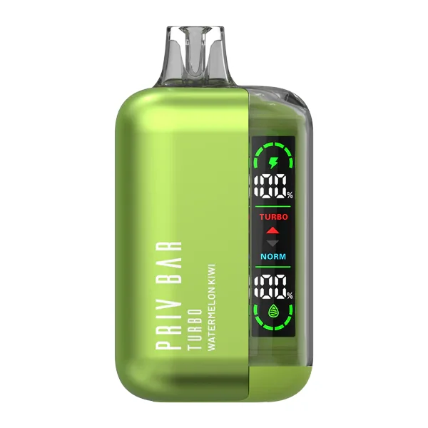 PRIV BAR TURBO DISPOSABLE VAPE 5-PACK Flavor : A dash of tropical kiwi flavor draws out the delicious flavor elements of this perfect watermelon vape. E-liquid contents : 16ml Nicotine Level : 50mg Puffs per Device : 15000/ 10000 Turbo Mode Battery : 800mAh (Rechargeable via USB-C) Master Case Qty : 200 Turbo Mode: Higher Wattage for a Bigger Taste and Puff Size LED Screen: Battery, e-Liquid, and Power Mode Indicators Adjustable Airflow Browse more disposable vape flavors