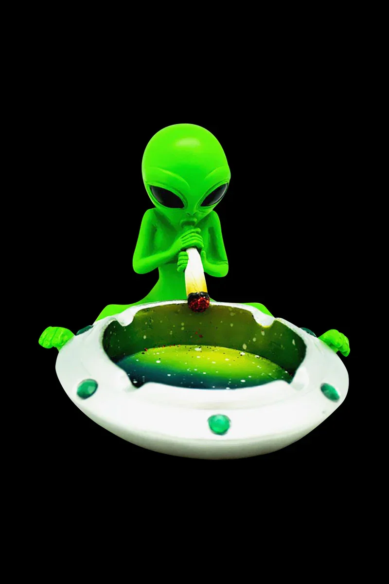 Now you can share your smoke seshes with your very own green alien stoner. This out-of-the-ordinary ashtray made of durable, heat-resistant polyresin material features an alien smoking a red-tipped joint that's dropping embers into space. Imagine the look on your friends' faces when they see this ashtray on your table at your next get-together! This awesome ashtray has built-in cigarette rests and a nice roomy ash bowl that's shaped like a flying saucer. At 4-inches wide by 3-inches tall , this is a compact ashtray that won't bogart much space on your table. It's super cool and an ashtray everyone will be more than happy to use to keep your smoke seshes neat and tidy.