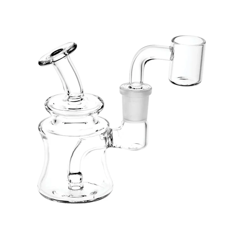 If you enjoy dabbing on the go, this 4-inch tall Clear Glass Mini Rig is perfect! It's crafted from extra-durable borosilicate glass to ensure its longevity. It features a 14.5mm female joint and comes with a fused downstem perc to smooth and filter your rips. Also included is a 14.5mm male quartz banger with a generous 18mm inner diameter that easily accommodates big dabs! This travel-friendly rig features an angled mouthpiece for comfortable use. It's fun to use, easy to clean, and a piece that fits into your backpack or purse for discreet travel. All in all, this portable rig is an awesome piece that will easily meet your dabbing requirements, whether your a newbie or seasonsoned dabber!