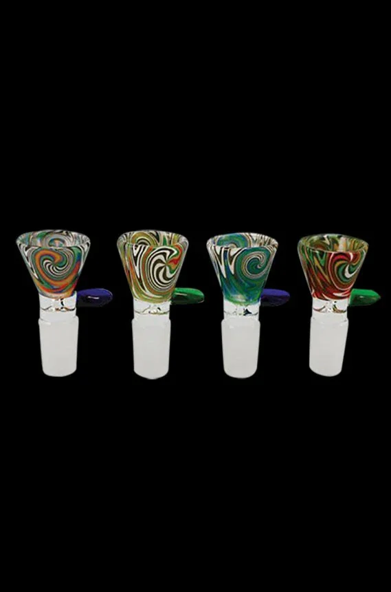 Bring a hint of color to your favorite bong with this Worked Herb Slide . This slide is funnel shaped and made with borosilicate glass. Each has a unique swirl pattern in different colors, which match to the handle on the side. The slide is designed to fit 18.8mm female glass on glass joints. This item will ship in a random color depending on availability.
