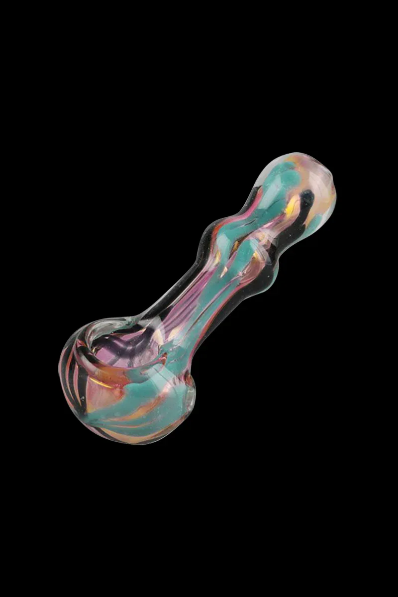 This sexy, curvy glass pipe is 4-inches long and made of thick and durable boro glass. This is a sturdy piece that fits nicely in the palm of your hand. The Gold Fumed Wigwag Hand Pipe is literally a work of art. This beautiful glass pipe features a wavy & colorful gold-fumed design. It's all made by hand so the color & design may vary slightly from what's pictured. You'll be in for a fun surprise when you receive your hand pipe in the mail and will undoubtedly love the one-of-a-kind piece you get! With its deep recessed bowl and left side carburetor , this pipe is a pleasure to smoke. Get your hands on one fast while supplies last!