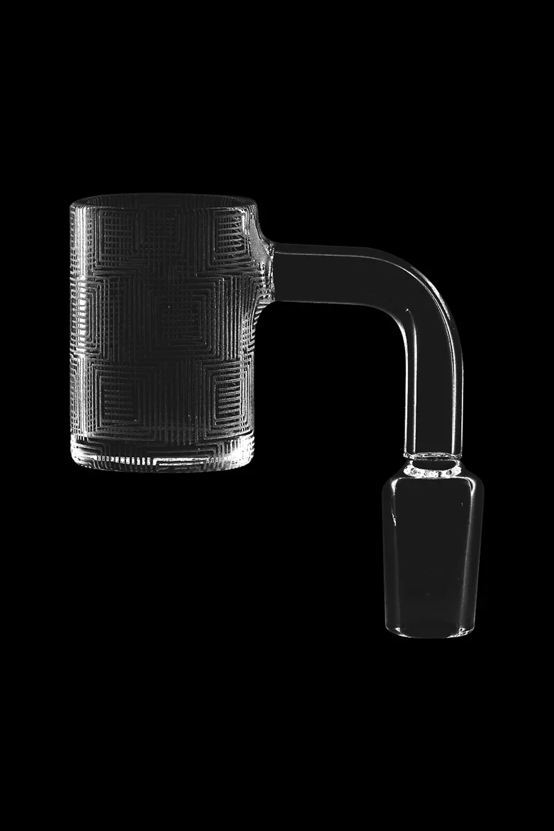 This banger made of 100% quartz has a 14,5mm male joint that's situated at a 90-degree angle for ergonomic use. It features a subtle etched circle design that's easy to miss but hard to forget! The longer your sesh goes on, the more fascinating the banger design will get… and what’s not to love about that? Banger dimensions: 25mm outer diameter, 21mm inner diameter; 35mm height, 31mm depth.