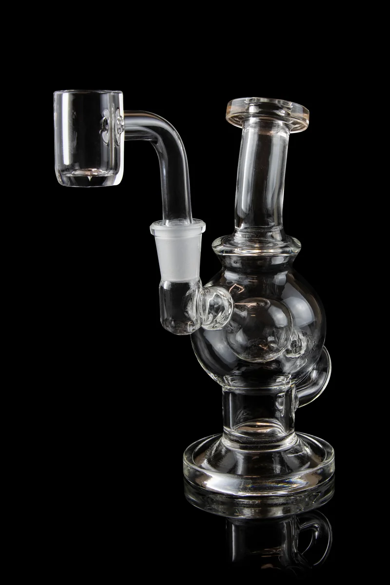 This 5-inch tall rig is properly equipped to send your smoke on a dabtastic journey throughout its clear glass body. This intricately designed little rig is made of durable borosilicate glass that's known for its ability to withstand high heat. The rig is outfitted with a 14.5mm female joint and a fixed downstem that leads to a ball-style percolator. When you hit this rig, the smoke mixes with water and travels through the extra recycler tube back into the chamber then up through the bent neck to your awaiting lips on the rimmed mouthpiece. You'll flip over how smoothly this little dab rig hits! It's supported by a thick round base and comes with a 14.5mm male quartz banger with a deep bucket.