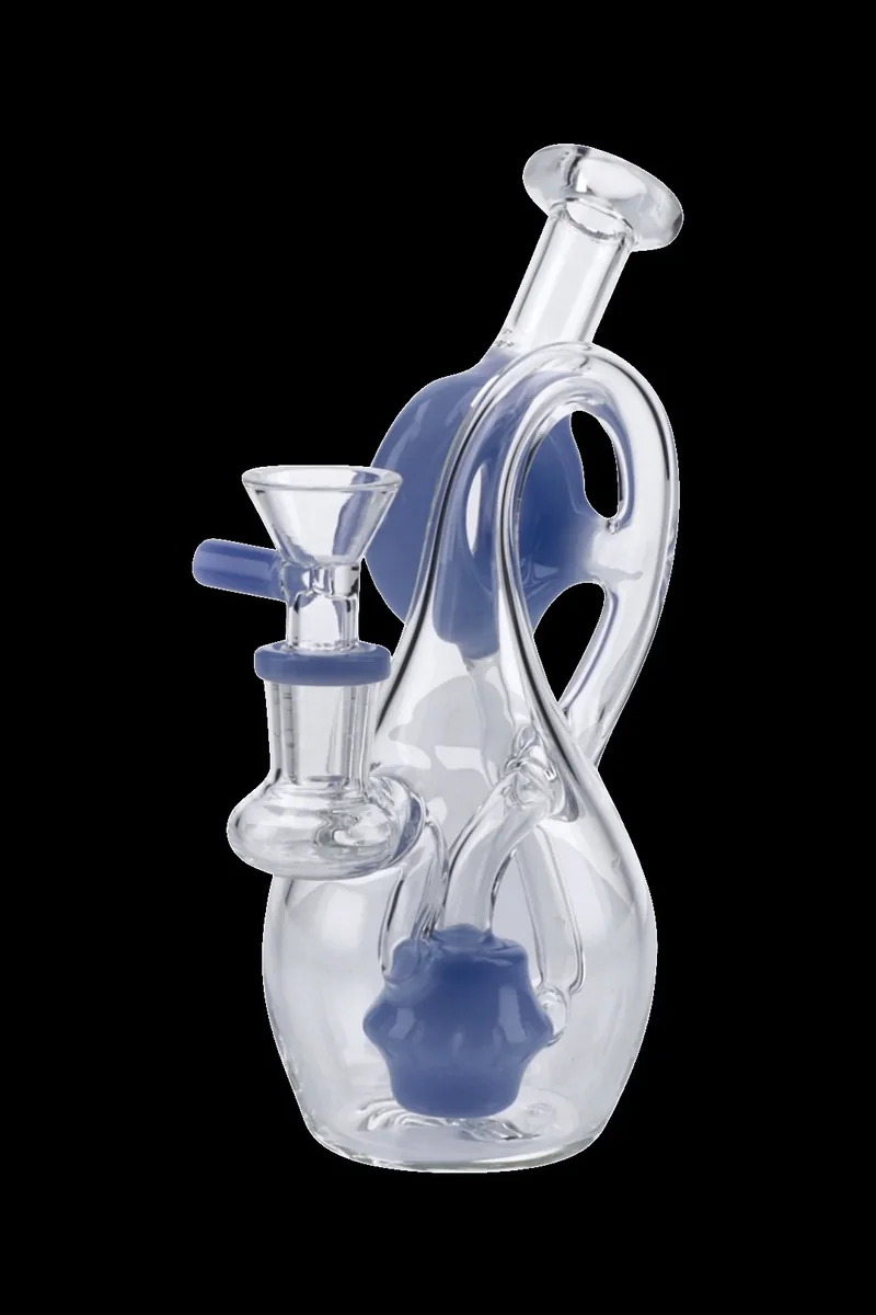 Meet the Mini Recycler Water Pipe , standing tall at 7 inches and crafted from high-quality glass. Don't let its size fool you; this little powerhouse is designed to deliver nothing short of smooth, filtered hits that'll elevate your smoking experience. Here's how it works its magic: as the smoke makes its way up through the glass loop towards the mouthpiece, it gets a second chance to be filtered. The percolator does its job multiple times, ensuring each hit is as smooth as can be. It's like recycling your smoke for an even better experience! Style meets function with colored accents, available in your choice of milky purple or milky blue. The angled mouthpiece adds a touch of convenience, while the 90-degree joint, paired with the included dry herb bowl, completes the package. The Mini Recycler is here to deliver satisfaction in every hit. Choose your color, and get ready for an upgraded smoking experience!