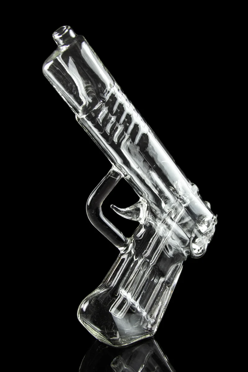 All the advantages of a water pipe and a hand pipe combined into an edgy, stylish piece that is sure to blow the lid off any sesh. Pop a couple caps into your mind and blast off to the stratosphere with the help of the Smoking Gun Glass Bubbler. At 8" inches and made out of hand-blown borosilicate glass, you'd think it could stop a bullet (it can't). This bubbler is a unique piece that's a ton of fun to use and will make you the coolest person at any party (not that you weren't already), all while drawing smooth, thick hits in a flash.