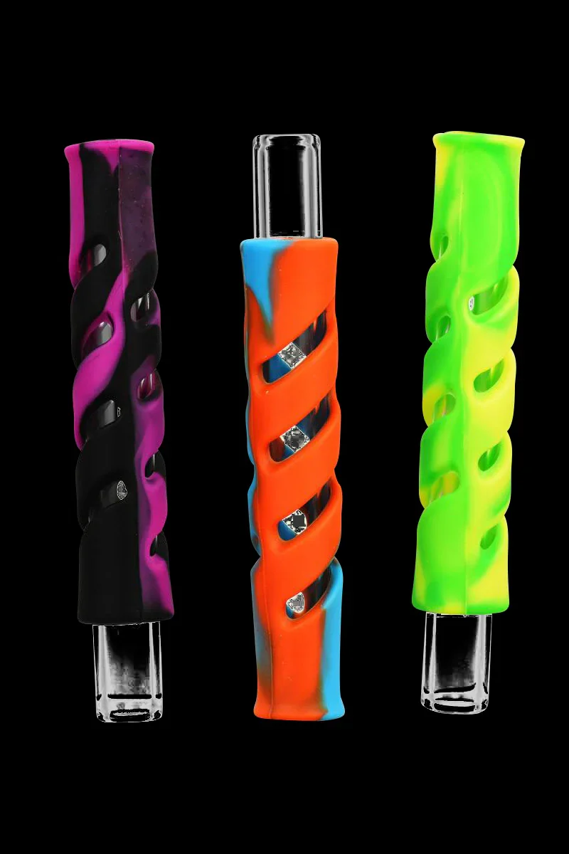 Need a new taster for your 4" dugout? Maybe you've broken your bat or lost it. This colorful and durable 4-inch glass taster features a protective silicone sleeve to protect it from bangs and drops and to keep your fingers cool. The glass portion of this taster bat is made from sturdy borosilicate glass. The protective silicone sleeve makes the one-hitter easy to hold and use. These 4" swirled silicone-wrapped glass tasters come in random colors, so you'll be pleasantly surprised by the one you get. These taster bats make great gifts for anyone who enjoys taking discreet hits on-the-go. Pick up a few so you have an extra and one to use as a gift.