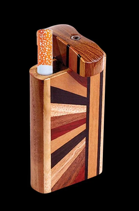 Quality craftsmanship is front and center on this dugout made entirely out of wood. It features an eye-catching horizon woodworked design you'll never tire of. The dugout comes with a metal taster bat that's deguised to look like a regular cigarette. The taster bat is housed inside a spring-loaded chamber. There's a swivel lid on top for quick and easy use and to secure the contents when not in use. This beautiful piece is available in small and large sizes. The smaller one is 3.5" and the larger one is 4" long. This fine woodworked dugout is ideal for tavel and can easily fit in your pocket or bag.