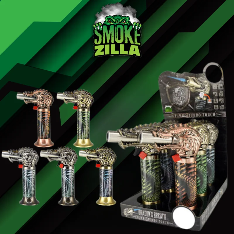 SMOKE ZILLA - DRAGON JUMBO TORCH DISPLAY OF 6 (23667) Adjustable butane torch lighter generates a blue flame that is wind resistant and works at any angle - even upside down! This is the perfect lighter for lighting fireworks, cigars, cigarettes and more - especially outdoors.
