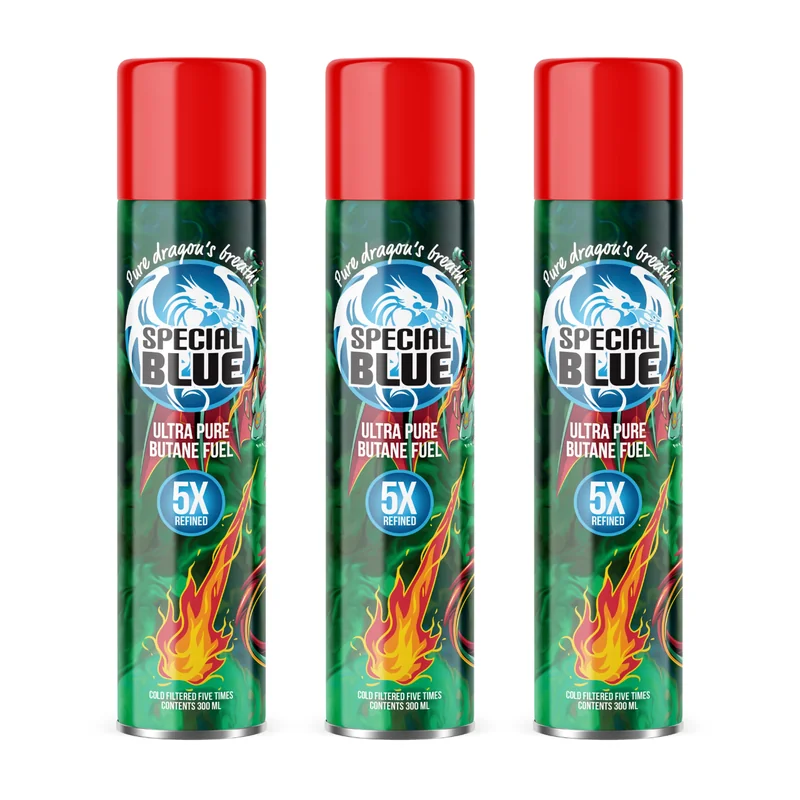 BUTANE SPECIAL BLUE 5X EUROPEAN 300 ML X 12 CT/BOX Refuel with confidence using Special Blue 5X European Butane – 300ml x 12ct/Box . Specially refined through a 5x filtration process , this premium-grade butane ensures cleaner burns, smoother ignition, and extended lighter and torch performance . Each 300ml canister is engineered for universal compatibility and includes multiple nozzle adapters, making it suitable for most refillable lighters and torches. The European-quality refinement reduces
