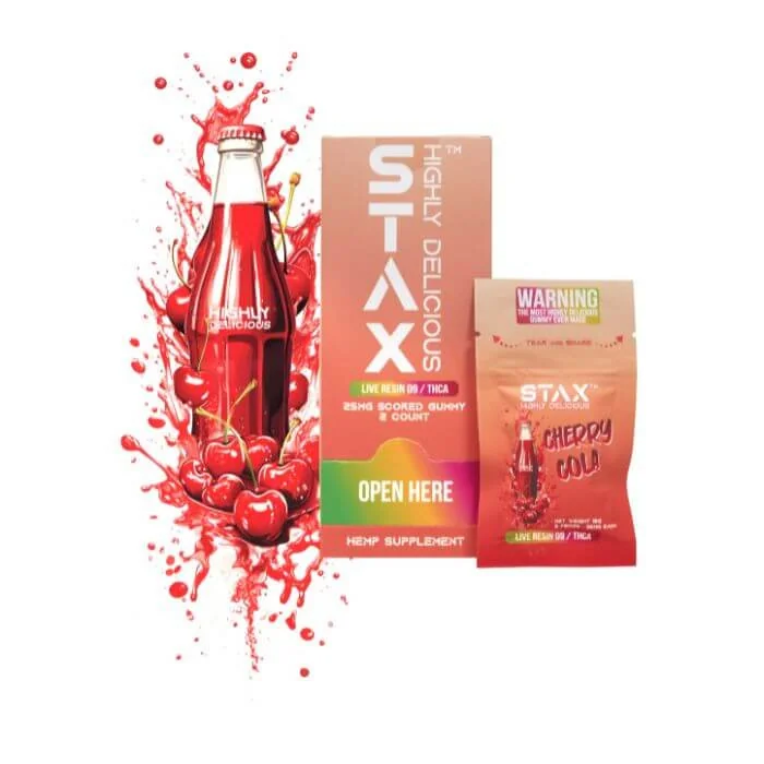 Indulge in the premium potency of Stax Live Resin Delta 9, THC-A Gummies. Crafted with live resin extract, each 25mg gummy offers a smooth, flavorful experience that combines Delta 9 and THC-A for balanced effects. With 50 gummies per pack (2 gummies per pouch), these edibles are designed for easy, measured enjoyment, bringing you a potent and consistent experience with each bite. Flavor Descriptions: Cherry Cola: Sweet and fizzy cherry cola flavor with a hint of nostalgia, perfect for a refreshing, uplifting high. Guava Jelly: A tropical burst of exotic guava with a sweet, fruity finish, ideal for mellow relaxation. Product Highlights: Strength: 25mg of Delta 9 and THC-A per gummy Quantity: 50 total gummies (2 per pouch, 25 pouches per pack) Premium Live Resin: For a robust, full-spectrum experience Lab-Tested: Ensures quality, potency, and purity Experience the next level of infused edibles with Stax Live Resin Gummies—a balanced, flavorful journey in every pack.