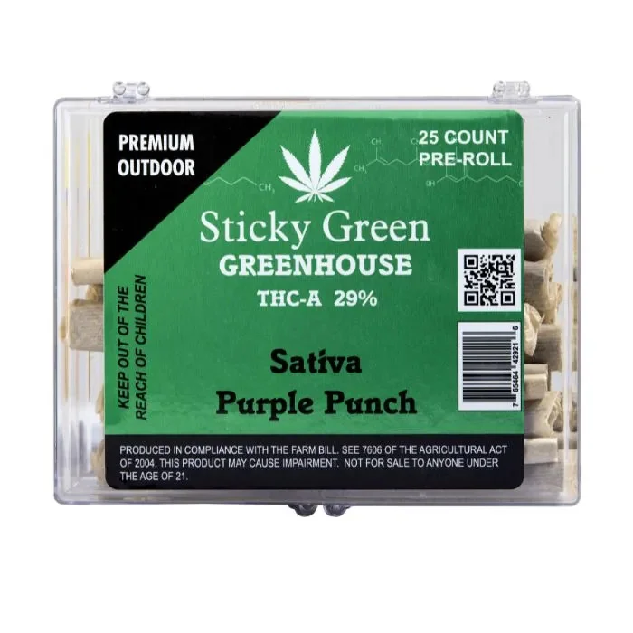 Elevate your smoking experience with Sticky Green's Greenhouse THC-A Pre-Rolls. Each 1.5 gram pre-roll is crafted from premium greenhouse-grown flower, ensuring a potent and flavorful session. Available in 25-count packs, these pre-rolls are perfect for both retail and wholesale customers seeking quality and consistency. Available Strains: Gelato 44 (Hybrid): A balanced blend offering sweet, dessert-like flavors with a harmonious mix of relaxation and euphoria. Lemon Haze (Indica): Rich citrus notes provide a refreshing taste, leading to calming and soothing effects ideal for unwinding. Purple Punch (Sativa): A burst of fruity flavors with uplifting and energizing effects, perfect for daytime use. Experience the difference with Sticky Green Greenhouse THC-A Pre-Rolls, where premium quality meets exceptional flavor.