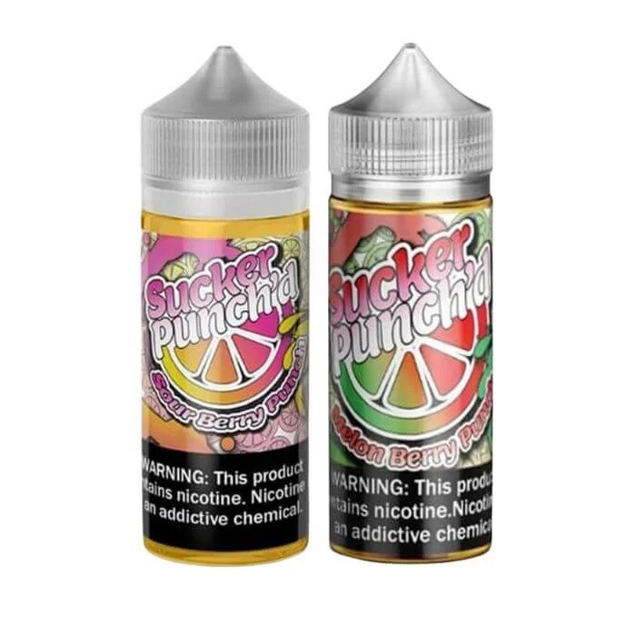 Introducing the new Sucker Punch'd E-Liquids, available in 100ml bottles with nicotine options of 0mg, 3mg, and 6mg. These bold e-liquids pack a punch with intense fruity flavors, offering a satisfying and flavorful vaping experience. Crafted for those who crave bold tastes, Sucker Punch'd E-Liquids deliver smooth vapor production and vibrant flavors in every puff. Ideal for vape enthusiasts looking for high-quality juice with a fruity twist. Flavors: Melon Berry Punch – A juicy blend of ripe melon and sweet berries, delivering a refreshing burst of fruity goodness. Sour Berry Punch – A tart and tangy mix of berries, creating a perfectly balanced sour-sweet punch for berry lovers. Sucker Punch'd E-Liquids are a must-try for those seeking a flavor-packed experience.
