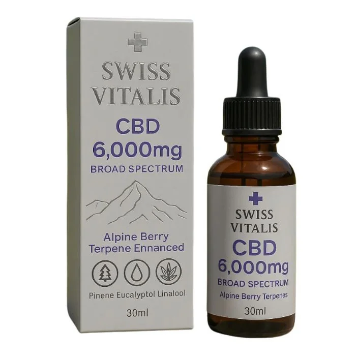 Discover Swiss Vitalis Broad Spectrum CBD 6000mg, a premium THC-free formula crafted for balance, clarity, and overall wellness. Enhanced with Alpine Terpenes, this high-potency oil combines Swiss precision and natural purity to support your daily routine. Whether you’re a retailer, wholesaler, or individual seeking dependable CBD, Swiss Vitalis delivers clean, consistent results every time. Alpine Terpene Blend — Flavor & Effect Profiles α-Pinene – Crisp and pine-like, supports focus and healthy respiratory function. β-Caryophyllene – Warm, peppery notes that promote a balanced inflammatory response. Eucalyptol – Fresh, cooling taste for clear breathing and mental sharpness. Linalool – Floral lavender aroma that encourages calm and relaxation. Swiss Heritage — Pure by NatureInspired by the Alps, Swiss Vitalis emphasizes natural purity from sourcing to bottling. Every batch is free from THC, fillers, and harsh solvents, ensuring a premium CBD oil you can trust. Why Choose Swiss Vitalis Broad Spectrum CBD 6000mg Verified 0.0% THC Accurate cannabinoid & terpene profile Free from pesticides, heavy metals, and residual solvents Full-panel third-party COAs available for complete transparency Experience the strength of Swiss craftsmanship and Alpine botanicals in every drop. Swiss Vitalis Broad Spectrum CBD 6000mg is designed for those who demand quality, consistency, and trust in their wellness journey.