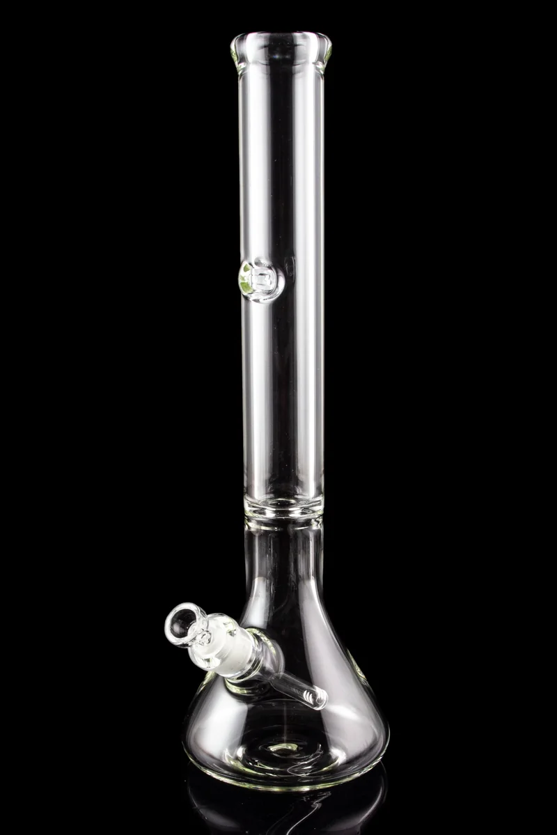 Tank Glass isn't just a cool name. Once you see the durability of their glass pieces, you'll be speechless. They've taken this incredible craftsmanship and created the larger-than-life MAX Beaker . At 18 inches tall , it's a true towering inferno. Its American-blown 9mm thick glass makes it as close to indestructible as glass can get. The top reaches almost as high as it'll make you. With a reinforced base and super thick tank joint, it's not going anywhere. With an included 14mm bowl and downstem , this piece is sure to be one of your most cherished. Now available in a bundle that includes a g old Tank adjustable downstem and a gold Tank tactical bowl.