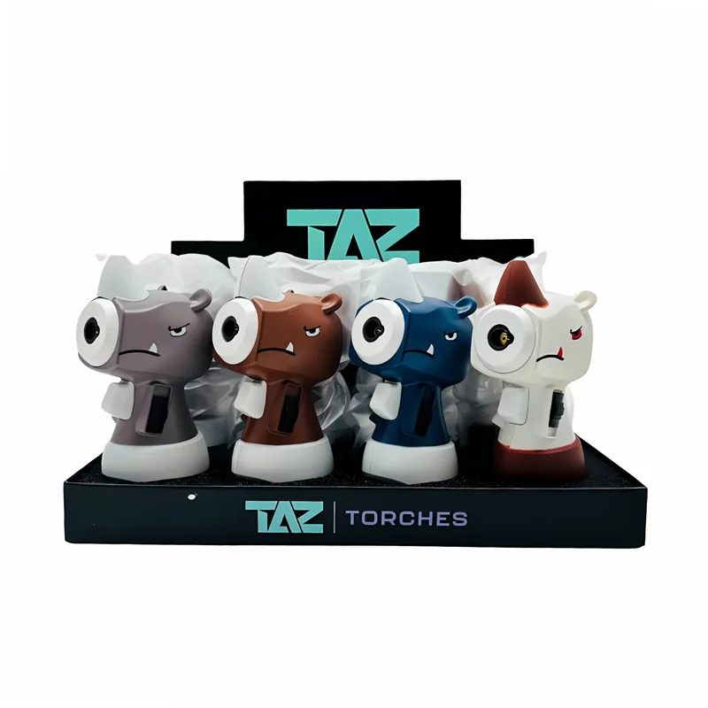 TAZ TORCH MINI CARTOON DINOSAUR DESIGN TORCH DISPLAY OF 12 (TT-75B) Add fun and character to your torch lineup with the TAZ Torch Mini Cartoon DINOSAUR Design Torch – Display of 12 (TT-75B) . Featuring a cute cartoon-style dog design , these novelty mini torches combine playful aesthetics with reliable flame performance, making them appealing for both everyday use and as collectibles. Each mini torch produces a strong, windproof flame , ideal for lighting cigars, bowls, bangers, and more. The co