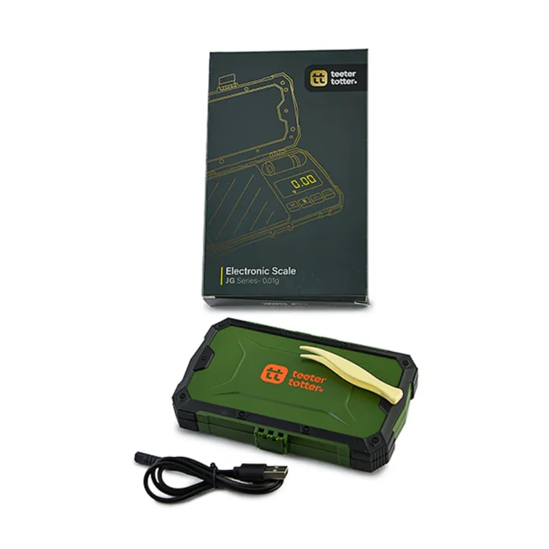 TEETER TOTTER ELECTRONIC SCALE JG SERIES 0.01G SCALE The Teeter Totter Electronic Scale JG Series is a high-precision mini scale designed for accurate and efficient weighing with a 0.01g precision level . This compact digital scale is perfect for measuring herbs, concentrates, jewelry, and other small items . With its sleek, portable design , it’s easy to use at home or on the go. The easy-to-read digital display, tare function, and durable construction make it a reliable and essential tool for