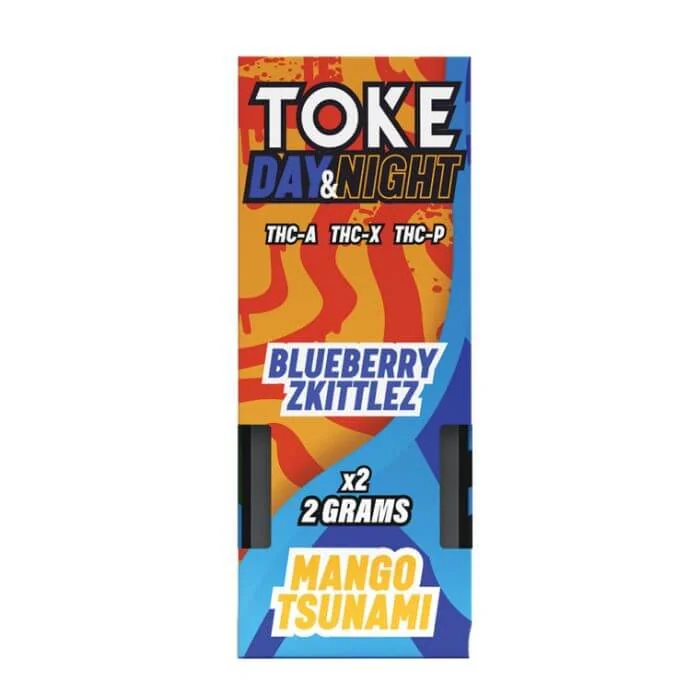 Introducing the TOKE Day & Night Series Disposable Vape Pens, infused with a potent blend of THC-A, THC-X, and THC-P cannabinoids. These dual 2-gram disposable vape pens are designed to deliver a rich, well-rounded vaping experience, perfect for both relaxation and euphoria. Whether you need to unwind or enhance your day, these pens offer a versatile solution to elevate your vaping experience. Product Details: What's in the Box?: Each pack contains two 2-gram disposable vape pens for convenient, long-lasting use. Cannabinoid blends: Infused with THC-A, THC-X, and THC-P for a balanced, potent experience. Strains: Each box features premium strains of both Indica & Sativa hemp derived cannabinoids Flavor & Strain Descriptions: Pink Runtz & Berry Pie (Indica - Sativa): Indulge in the perfect balance of relaxation and euphoria. Blueberry Zkittles & MangoTsunami: ndulge in the sweet and tangy essence of ripeblueberries combined with the tropical allure of juicy mangoes. Lemon Lime Kush & PeachCobbler (Indica - Sativa): Immerse yourself in the invigorating citrusy zest ofLemon Lime Kush, perfectly complemented by the sweet and comforting essence of PeachCobbler. Bubblegum OG & Raspberry Cough: Each puff brings a burst ofnostalgia with the classic taste of Bubblegum OG, followed by the refreshing twist ofRaspberry Cough. Strawnana & Orange Cookies: Each puff transports you toa blissful paradise, where the luscious flavors of ripe bananas and juicy oranges dance onyour palate. 21+ TO PURCHASE – ADULT USE ONLY. KEEP OUT OF REACH OF CHILDREN & PETS. WARNING:This product may cause intoxication and a positive drug test. THC-A DISCLAIMER/NOTICE:This product is not available for shipment to the following states: Alaska, Arizona, California, Colorado, Connecticut, Delaware, Idaho, Iowa, Michigan, Mississippi, Montana, Nevada, New Hampshire, New York, North Dakota, Oregon, Rhode Island, South Carolina, Utah, Vermont, Virg