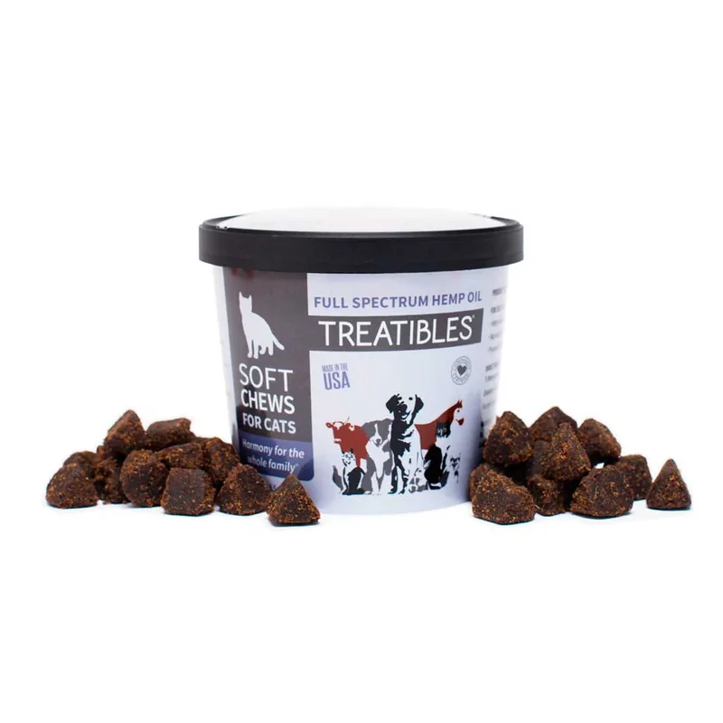 1.5 mg Organic Full Spectrum Hemp Oil in each Soft Chew for Cats Treatibles Soft Chews are ideal for senior cats or those who prefer a softer consistency. These chews feature organic full spectrum hemp, catnip, turmeric, papain and bromelain. The oil is sourced from our own organic hemp farms in four states. In addition to several therapeutic compounds, terpenes and flavonoids are included creating what is known as the entourage effect, providing a full spectrum of benefits for animals. We ensure the purest, most effective, non-psychoactive and non-toxic full spectrum hemp oil. Helps maintain normal emotional balance and promotes relaxation Enhances function of joint and connective tissue Supports digestive tract health and assists the immune system ACTIVE INGREDIENTS PER CHEW (44 mg): A proprietary blend of catnip leaf powder, turmeric root, organic full spectrum hemp oil, papain (papaya), bromelain (pineapple stem) INACTIVE INGREDIENTS: Acacia gum, apple pectin powder, calcium sul...