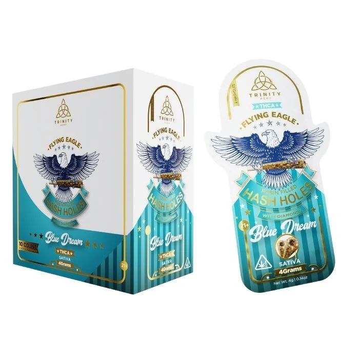 Trinity Flying Eagle Rosin THC-A Hash Holes are premium, slow-burning pre-rolls crafted for elevated performance and standout shelf appeal. Each pack includes two rosin-filled hash hole pre-rolls infused with THC-A diamonds, totaling 4 grams of high-quality material. Expertly rolled for a consistent draw and even burn, these hash holes feature a rich rosin core designed to enhance longevity and overall experience. The addition of THC-A diamonds delivers a potent, high-end option ideal for experienced consumers seeking top-tier products. Packaged in a convenient 2-count format, Trinity Flying Eagle Hash Holes are perfect for smoke shops, dispensaries, and wholesale distribution, offering premium presentation with strong consumer demand. Available Flavors: Blue Dream (Sativa): Smooth and balanced with a clean, uplifting profile. Cali Gold (Indica): Rich and bold with a deeply relaxing finish. GSE x Gelato (Hybrid): Well-rounded and refined with a smooth, premium feel. Kush Berry (Indica): Full-bodied and calming with a rich character. Strawberry Haze (Sativa): Bright and energetic with a smooth, refreshing edge. Watermelon Dream (Hybrid): Light, smooth, and evenly balanced. Product Highlights Total Weight: 4g (2 hash hole pre-rolls) Rosin-filled with THC-A diamonds Slow-burning, even performance Premium packaging for retail and wholesale Trinity Flying Eagle Rosin THC-A Hash Holes deliver potency, craftsmanship, and premium shelf appeal.