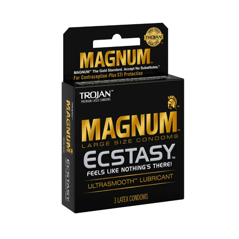 TROJAN MAGNUM ECSTASY ULTRASMOOTH LUBRICATED 3CT LATEX CONDOMS PACK OF 6 Elevate your intimate moments with TROJAN MAGNUM ECSTASY ULTRASMOOTH LUBRICATED 3CT LATEX CONDOMS PACK OF 6. These premium condoms are designed for those who need a larger fit, offering the comfort and security of Magnum with the added pleasure of an ultrasmooth lubricant. The unique shape provides freedom of movement for a more natural experience, while the ultrasmooth lubrication enhances comfort and sensitivity. Each pac