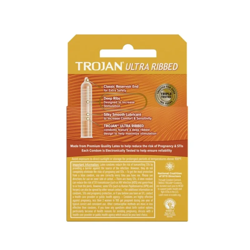 TROJAN ULTRA RIBBED BROWN 3CT LATEX CONDOMS PACK OF 6 Enhance pleasure for both partners with TROJAN ULTRA RIBBED BROWN 3CT LATEX CONDOMS PACK OF 6. These premium condoms feature deep ribbing along the shaft, designed to increase stimulation and intensify sensation. Made from high-quality latex and lubricated for comfort, these condoms provide the trusted protection of Trojan while adding an extra layer of pleasure. Each pack contains 3 ultra-ribbed condoms, and this set includes 6 packs, making