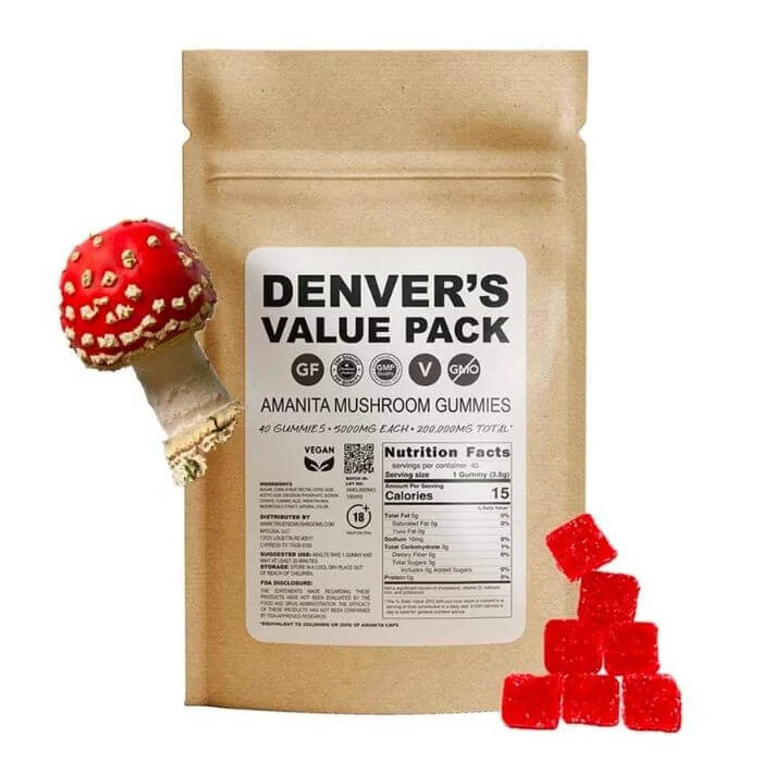 Introduce your vape shop customers to the highest quality Amanita Muscaria gummies made in America with Denvers Amanita Muscaria Gummies Bag. These gummies are crafted using advanced extraction and processing techniques, resulting in a highly bioavailable full-spectrum Amanita mushroom extract. What sets these gummies apart is Denvers' exclusive MUSC™ (Mushroom Ultra-Sonic Cavitation) technology, which claims to increase bioavailability up to 10x by breaking down the mushroom's chitin and unlocking the active compounds. Each gummy contains the equivalent of 500mg of 10x MUSC™ extract, which is equivalent to 5000mg of Amanita Muscaria with significantly higher bioavailability than other brands. With Denvers Amanita Muscaria Gummies Bag, your customers can experience the benefits of this exceptional product. Denvers Amanita Muscaria Gummies Bag Features: 40 gummies per bag. 5000MG per gummy.