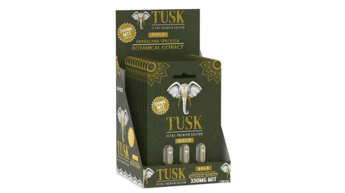 The Tusk - Kratom Capsules - Gold 330MG MIT - (3ct) Display of 10 by Tusk Kratom is a premium botanical product for your shop's kratom and wellness section. Comes in a quantity of display of 10. 3-count package for maximum value. Suggested retail price $14.99. Growing category with strong customer loyalty. Available at wholesale pricing from Port City Wholesale.