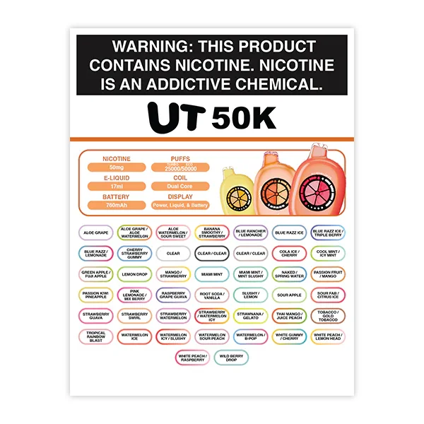 MARKETING MATERIALS Showcase the full range of flavors for the UT 50K disposable vape line colleciton by UT BAR with this laminated flavor menu . Designed for durability and visual appeal, this menu highlights the high-quality and versatile UT 50K , featuring a flavor boosting technology for convenient use. The 8.5" x 11" laminated design ensures the menu withstands daily use in vape shops , helping your customers easily explore the variety of available flavors. Perfect for in-store displays, this flavor menu adds a professional touch to your vape section. Key Features: Dimensions: 8.5" x 11" Laminated for durability and long-lasting use Features UT 50K disposable vape with flavor control Displays a full list of flavors for customer convenience Limit: 5 menus per store View more Marketing Materials for all brands WHOLESALE VAPES
