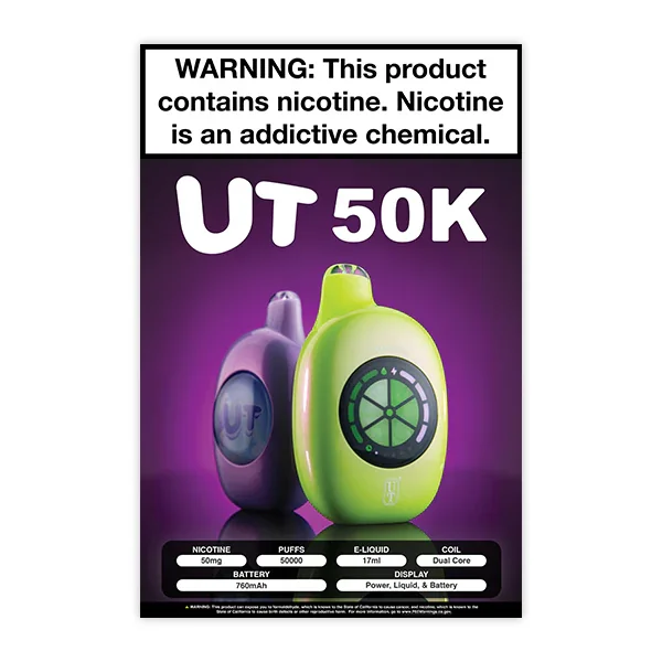 Showcase the UT 50K disposable vape by UT Bar with this striking 12-inch by 18-inch poster , perfect for drawing attention to this high-demand product. Designed to make an impact in your storefront windows or interior displays , this poster highlights the premium quality and style of this popular product. A must-have marketing tool for vape shops, smoke shops, and convenience stores looking to boost visibility and sales for this impressive product line. Key Features: Dimensions: 12" x 18" Promotes the UT 50K Disposable Vape Ideal for store windows and in-store displays Eye-catching design to increase customer interest and sales Limit of 2 posters per order Branded Marketing Materials