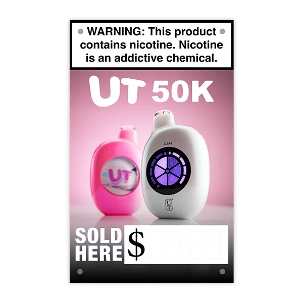 UT 50K Banner Vinyl Banner - 15"x24" - Durable Indoor & Outdoor Marketing Display Boost your store’s visibility with this high-quality UT 50K vinyl banner . Measuring 15 inches by 24 inches , this banner is designed for maximum impact in both indoor and outdoor settings . Draw attention to this powerful flavor control disposable vape. Featuring 4 pre-installed grommet holes , it’s easy to hang in multiple locations like windows, walls, or outdoor displays. The durable vinyl material ensures long-lasting use, even in challenging weather conditions. Ideal for vape shops and retail environments . Limit of 2 banners per order . Key Features: Dimensions: 15" x 24" Durable vinyl material for indoor and outdoor use 4 grommet holes for versatile hanging options Weather-resistant design for longevity Perfect for vape stores, retail stores, smoke shops and promotional displays Mi-Pod is your number one source for wholesale vapes , hardware, and alternative products. View more Marketing Materials