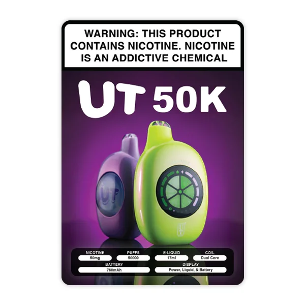 WINDOW STICKER UT 50K DISPOSABLE VAPE This 5" x 7.5" removable vinyl decal features the UT 50K Disposable Vape. It is a perfect for doors, windows, and glass countertop displays. These bespoke and high-quality materials advertise UT 50K at your vape shop, smoke shop, gas station or convenience store. Key Features: Dimensions: 5" x 7.5" Removable Vinyl Decal Features UT 50K Disposable vape Limit: 5 stickers per store View more Marketing Materials