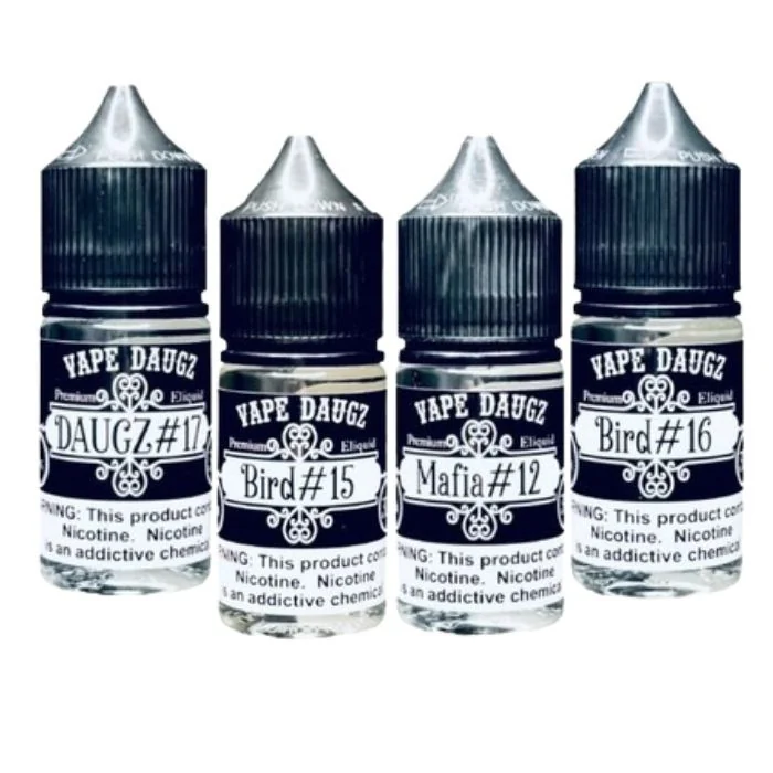 Experience the bold and diverse range of Vape Daugz Nicotine Salts, available in 30ml bottles and nicotine strengths of 0mg, 15mg, 35mg, and 50mg. Crafted for vape enthusiasts seeking intense flavor and satisfaction, these salts offer a wide selection of unique blends. Flavors: Bird #15: Pineapple Mango, a Sweet Tangy Pineapple Mango, smoothed out with a lovely vanilla. Bird #16: Verrry Berrry, Verrrry Berrrry made with the juiciest, sweetest Berries. Smoothed with a hint of vanilla for the prefect balance. D-Line #1: Strawberry Cheesecake, delightfully Sweet Strawberry Cheesecake with a Graham Cracker Crust. D-Line #2: Blueberry Cheesecake, sweet and Creamy Blueberry Cheesecake with Graham Cracker. D-Line #3: Cotton Candy Custard, Sweet Blueberry Cotton Candy Custard. D-Line #4: Mix of D-Line Flavors, an enticing blend of popular White Label "D-Line" Flavors. D-Line #5: Key Lime Pie, a perfectly blended Key Lime Pie custard with hints of Vanilla and Graham Cracker. D-Line #6: Vanilla Brown Sugar Custard, rich Vanilla Brown Sugar Custard. This E-Liquid will wrap you up in a warm blanket and tuck you in at night! D-Line #7: Strawberry Cheesecake ICE, a chilling combination of "D-Line #1" infused with a hint of cool ice. *Sweet Vanilla Cheesecake infused with a hint of cool ice. D-Line #8: Warm Vanilla Custard, Warm Vanilla Custard topped with light Cinnamon. D-Line #9: Orange Vanilla Custard, a sweet creamy custard paired with a light orange reminiscent of your favorite citrus ice cream pop. D-Line #10: Strawberry Banana Cheesecake, Sweet & Creamy Strawberry Banana Cheesecake with a delightful Graham Cracker Crust Daugz #17: Aged Whiskey Tobacco, Barrel Aged Whiskey Tobacco. Mafia #12: Creamy Vanilla Cheesecake, rich and Creamy Vanilla Cheesecake.