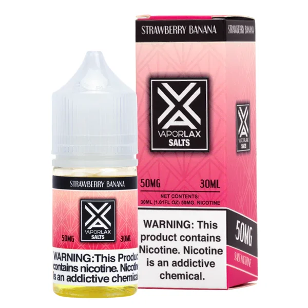 NICOTINE SALTS | SINGLE 30ML BOTTLE Flavor : Strawberry Banana by VaporLax is a dreamy blend of succulent strawberries and sweet ripened bananas dancing in your mouth. E-liquid contents : 30mL Nicotine Strengths : 25mg and 50mg Blended for use with Pod Systems Browse more E-Liquid Brands Here