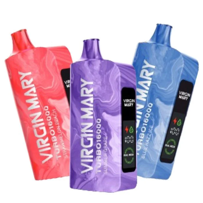 Introducing the Virgin Mary Turbo 16000, a cutting-edge vaping device engineered to elevate your vaping experience. Here are the product specifications: Puff Capacity: Enjoy up to 16000 puffs per device, ensuring prolonged vaping pleasure before needing a replacement. Airflow Control: Customize your vaping experience with adjustable airflow control, allowing you to tailor the inhalation intensity to your liking. Nicotine Content: Each device contains 50mg/mL of E-Liquid, delivering a satisfying nicotine hit with every draw. Battery: Equipped with a powerful 650mAh battery, ensuring extended use without frequent recharging. LED Indicator Display: Stay informed about battery life and device status with the full LED indicator display, providing easy monitoring at a glance. Type-C Rechargeable: Experience quick and convenient charging with the Type-C rechargeable port, ensuring minimal downtime between vaping sessions. Dual Mesh Coil: Enhance flavor and vapor production with the dual mesh coil technology, delivering a smooth and satisfying vaping experience. Flavors available: Baja Splash: Immerse yourself in the refreshing taste of Baja Splash, reminiscent of tropical fruits with a hint of citrus, delivering a burst of sunshine in every puff. Banana Cake: Indulge in the delectable flavor of Banana Cake, a creamy and decadent blend of ripe bananas and moist cake, satisfying your sweet tooth with every inhale. Blue Razz Ice: Experience the exhilarating fusion of bold blue raspberry paired with a cool menthol breeze in Blue Razz Ice, offering a perfect balance of tartness and freshness. Dr Cherry: Delight your senses with Dr Cherry, a classic soda-inspired flavor featuring the rich and sweet taste of cherries, delivering a nostalgic vaping experience. Miami Mint: Cool off with the invigorating flavor of Miami Mint, offering a refreshing blast of minty freshness that revitalizes your palate with each puff. Strawberry Kiwi: Savor the delightful c