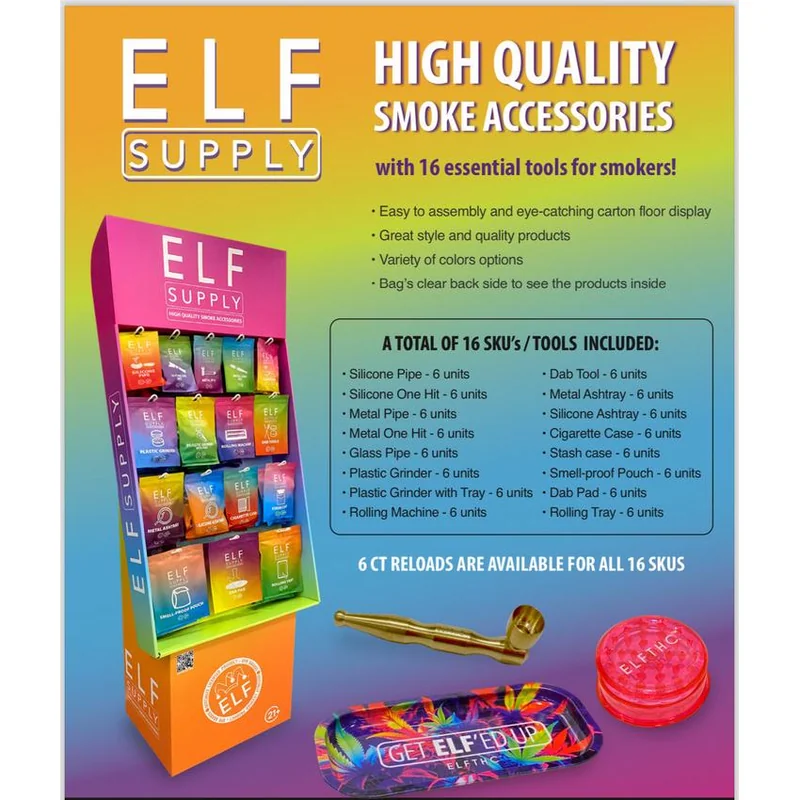 MSRP $4.99 PER SKU Elf Supply Display(16 Essential Smoker Tools) Unlock the secrets of mouthwatering, restaurant-quality smoked meats with the Elf Supply Display (16 Essential Smoker Tools). This comprehensive set equips you with the must-have tools to elevate your backyard barbecue game and impress your guests. From the precision digital thermometer to the heavy-duty meat claws, every item in this collection is designed to streamline your smoking process and produce flawless results. Effortlessly monitor internal temperatures, shred tender brisket, and maintain optimal smoke levels – all with the convenience of having your essential tools neatly organized and at your fingertips. Don't settle for subpar smoked dishes. Invest in the Elf Supply Display and unlock your inner pit master. With these 16 essential tools by your side, you'll be serving up mouthwatering, restaurant-worthy smoked meats that will have your friends and family begging for more. Experience the joy of perfecting your craft and savor the praise of your loved ones. Get the Elf Supply Display today and transform your backyard into a smoker's paradise. Features: • Easy to assembly and eye-catching carton floor display • Great style and quality products • Variety of colors options • Bag’s clear back side to see the products inside A TOTAL OF 16 SKU’s / TOOLS INCLUDED: • Silicone Pipe - 6 units • Silicone One Hit - 6 units • Metal Pipe - 6 units • Metal One Hit - 6 units • Glass Pipe - 6 units • Plastic Grinder - 6 units • Plastic Grinder with Tray - 6 units • Rolling Machine - 6 units • Dab Tool - 6 units • Metal Ashtray - 6 units • Silicone Ashtray - 6 units • Cigarette Case - 6 units • Stash case - 6 units • Smell-proof Pouch - 6 units • Dab Pad - 6 units • Rolling Tray - 6 units