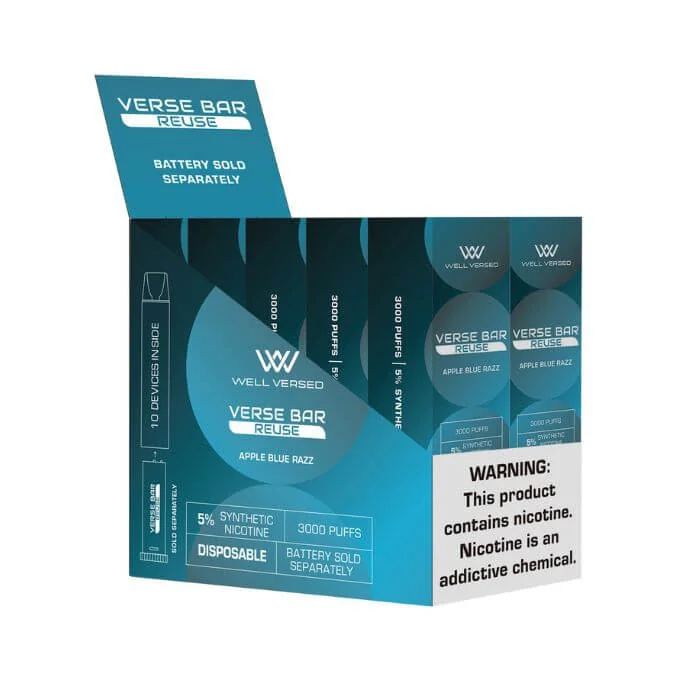 Discover the eco-conscious choice with Well Versed ReUse disposable vape pens. Each pen, available in a 10-pack, delivers 3000 puffs of 5% nicotine-infused e-liquid in a convenient, rechargeable design. With no batteries included, stock up now and offer your customers an environmentally friendly vaping option. Well Versed ReUse Vape Features: Available in 10 Pack. 50MG (5.0%) Nicotine by Volume. 7ml Pre-Filled E-Liquid. Approximately 3000 Puffs Per Device. Disposable - Non-Refillable & Rechargeable. Disposable Vape Pen With No Battery included. Battery needed for use. Well Versed ReUse Flavors: Razz Ice: Dive into a refreshing blend of tangy raspberry and icy menthol. Each puff delivers a crisp burst of fruity goodness paired with a cooling sensation. Pop & Rock It: Indulge in the nostalgic taste of your favorite childhood candy. Experience a symphony of sweet and tangy flavors that will keep you coming back for more. Stellar Burst: Blast off into a galaxy of flavor with this cosmic blend of tropical fruits. Transport your taste buds to new dimensions with every puff. Baja Blue: Transport yourself to the sunny shores of Baja California. This refreshing concoction of blue raspberry and citrus flavors is the perfect companion for a day in the sun. Apple Blue Razz: Experience the perfect balance of tart blue raspberry and crisp apple. This fruity fusion will tantalize your taste buds with every inhale. White Grape Cotton Candy: Indulge in the nostalgic sweetness of carnival days. This delightful blend of juicy white grape and fluffy cotton candy will satisfy your cravings. Blood Orange Fuji Apple: Immerse yourself in a burst of citrusy goodness. This refreshing combination of tangy blood orange and crisp Fuji apple is sure to invigorate your senses. Loops: Take a trip down memory lane with this nostalgic blend of fruity cereal and creamy milk. Transport yourself back to Saturday mornings spent in front of the TV. Well Versed ReUse Wholesale: Dive into our W