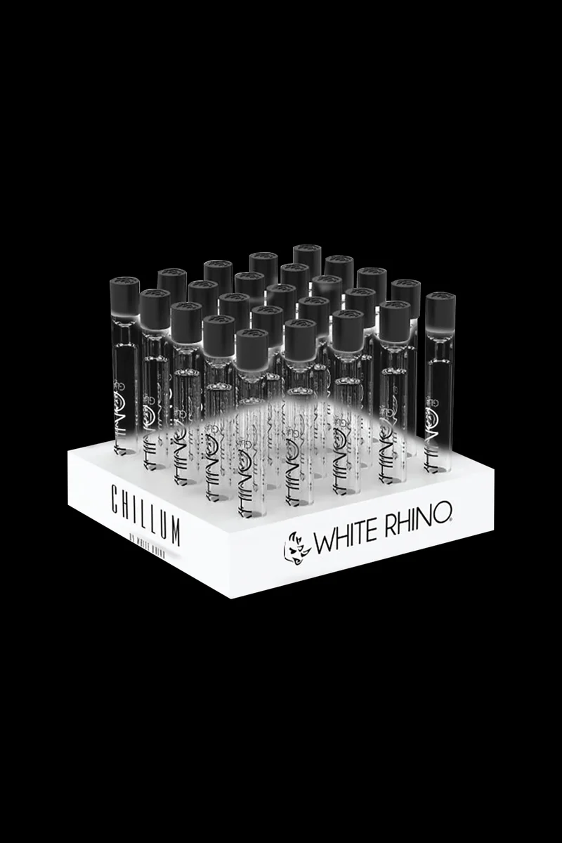 Experience a new way to enjoy your dry herbs with the White Rhino Glass Chillum - 25pc Display . The glass chillum is designed to give you an intense smoking experience that is definitely one-of-a-kind. Unlike traditional pipes, chillums are the perfect device to take on the go; with its small size and silicone cap, you can easily load and go — no mess or hassle! The White Rhino Glass Chillum is easy to use. If you’re new to one hitters, here’s what you need to do: simply remove the silicone cap, load the bowl up with finely grinded dry herbs — not too much! — and then light it up. Enjoy smooth and clean smoke right away since chillums don’t have carb caps. And don’t worry about being weighed down by heavyweight glass pieces - this durable but lightweight design makes enjoying your favorite dry herbal blends easier than ever before! So get ready for a truly unique smoking experience with the White Rhino Glass Chillum–better flavor and cleaner hits are waiting for you!