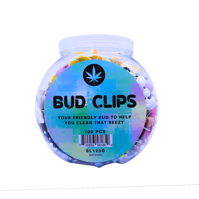 BUD CLIP ASSORTED DESIGN 100CT JAR Keep your smoking experience organized and stylish with the Bud Clip Assorted Design 100ct Jar. This jar contains 100 bud clips, each featuring a unique design to add flair to your smoking accessories. Perfect for securing joints, blunts, or cigarettes, these bud clips offer convenience and functionality. With assorted designs, you'll always have a fun and practical way to keep your smokes together. Elevate your smoking setup with the Bud Clip Assorted Design 1