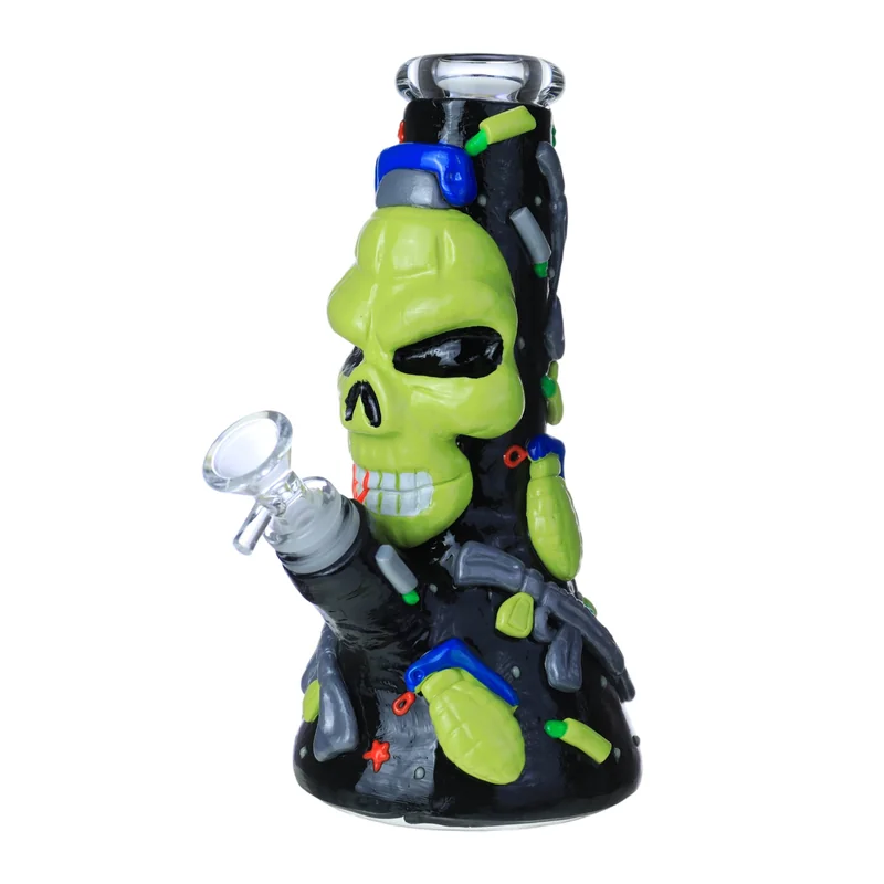 SKULL WITH GRENADE HEAVY DESIGN 9.5" WATERPIPE GLOW IN THE DARK (WP-607) The Skull With Grenade Heavy Design 9.5" Waterpipe (WP-607) delivers bold novelty styling, durable construction, and smooth smoking performance in a compact straight-tube format. Standing at 9.5 inches , this piece offers clean, cooled pulls with reliable water filtration—ideal for everyday use or as a standout addition to any glass collection. Built with a heavy, thick-glass design , this waterpipe provides added stability