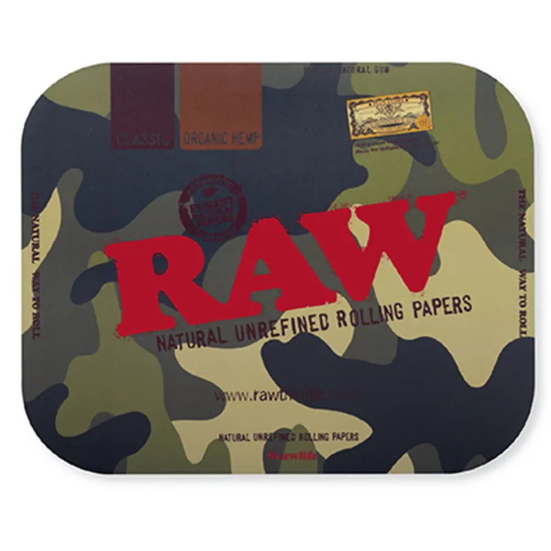 MSRP $6.99 The RAW camo Magnetic Tray Cover fits our metal rolling trays and are just so friggin perfect for quickly putting away your materials or for storage. Ding dong, doorbell rings – unexpected guests while you’re rolling up! No problem, just throw on the magnetic cover and everything is away. Many of our friends also use them to keep pet hair off their tray and materials. The magnetic cover is extra thick and can be used as a second rolling surface! RAW camo Magnetic Tray Cover (tray not included) . Large: 14″ x 11″
