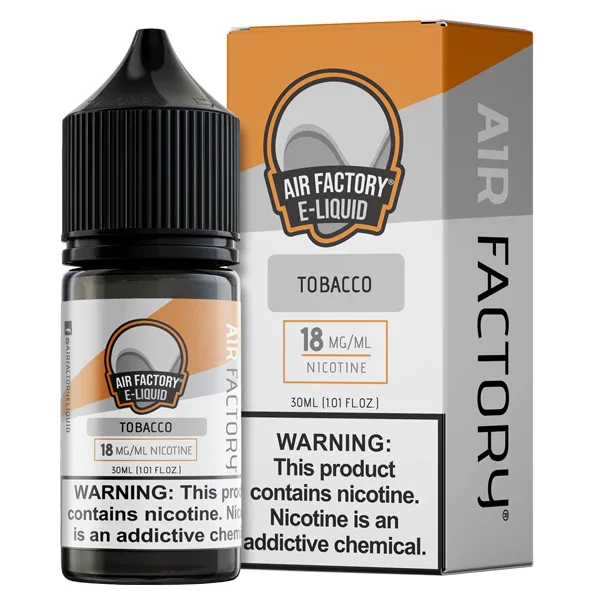 NICOTINE SALTS | Individual Bottle Flavor : Tobacco is a savory nicotine salt e-liquid by Air Factory that is full-bodied, smooth and satisfying. E-liquid contents : 30mL Nicotine Strengths : 18mg and 36mg Blended for use with Pod Systems Browse more E-Liquid Brands Here