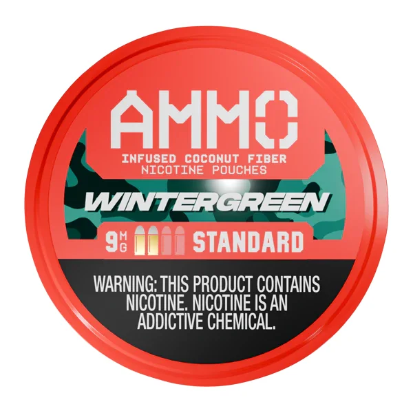5-PACK OF POUCH CANS Flavor : Wholesale Ammo nicotine pouches at Mi-Pod are available in a cool and classic Wintergreen flavor. Wintergreen Ammo pouches offer a smooth experience with coconut-fiber technology and higher nicotine strengths than rival products. Nicotine Level : 9mg (Standard), 12mg (Strong) or 15mg (Magnum) per pouch Can QTY: 15 nicotine pouches per can Retail Case Size : Sold in 5-Pack of Cans Patented Coconut-Fiber Pouch Technology Extended, long-lasting nicotine release Assembled in the USA Vapor Free Nicotine Alternative Browse all Wholesale Nicotine Pouches